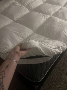 This mattress topper blew my mind. The comfort was incredible, which I think is down to the fact that it’s filled with a fusion goose down. The fusion material is for moisture-wicking properties so that you can sleep cooler and more comfortably.